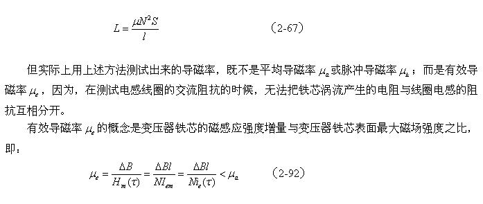 很多人在测试变压器铁芯导磁率的时候,都是通过测试变压器线圈电感量的方法来测试变压器铁芯的导磁率;这种测试方法实际上就是测试电感线圈的交流阻抗,然后把阻抗换算成线圈的电感量,最后再根据(2-67)式求出变压器铁芯的导磁率。