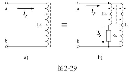 图2-29-a中,Le是一个同时考虑涡流损耗因素的电感;L是变压器原初级线圈的电感;Rb是铁芯涡流损耗电阻;Lb是一个互感线圈,通过它把流过电阻Rb的电流感应到变压器初级线圈中;当流过电阻Rb的电流增加时,流过通过Lb互感线圈的感应作用,使流过变压器初级线圈L的电流也同时增加。