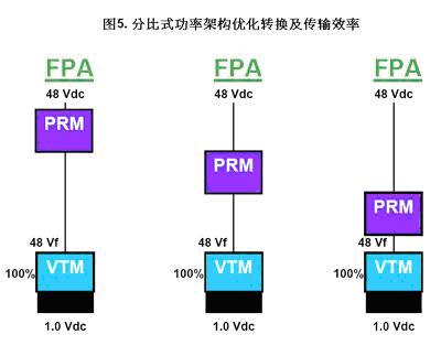 [page]由于VTM负责在负载点变压,它的K比值最高可达到200,分比母线因此无须受负载电压限制,可设定在任何一点上,甚至可把分比母线设定跟电源电压相同。如图5,负载电压是1V,分比母线可设定为48V,完全不受负载电压或PRM与VTM的距离影响,不需在输送损耗与转换损耗中折冲取舍。重点是FPA把变压的部份放在负载点,克服了IBA面对的难题,占空比可达100%。