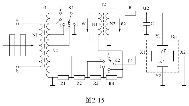 在图2-15中,变压器T1为信号源,通过K1选择变压器T1次级线圈的抽头就可以改变信号源的电压输出;T2为待测变压器样品,Dp为示波器;R1、R2、R3、R4为显示磁场强度H的取样电阻,取样电压u1作为示波器X轴偏转显示输入电压,通过K2可以选择取样电压输出,从而可以改变示波器X轴偏转显示的宽度;电阻R和电容C为积分电路,积分电压u2由电容C两端输出,作为示波器Y轴偏转显示输入电压,以显示磁通密度B。