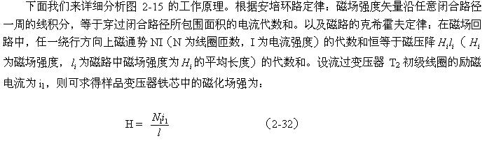 (2-34)式表明:在图2-15中,任一时刻取样电压u1均与磁场强度H成正比,因此,电压u1可以作为示波器X轴输入电压,用示波器的水平方向来显示磁场强度H。