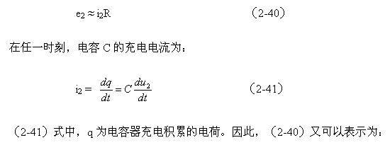 (2-39)式中,i2为流过电阻R的电流,或电容器的充电电流,u2为电容C两端电压。与分析变压器初级线圈中的励磁电流一样,如果把积分电路的时间常数取得足够大,电阻的阻值也取得足够大,则在一个周期内电容两端的充电电压u2相对电阻的电压降是可以忽略的。则(2-39)式可以改写为: