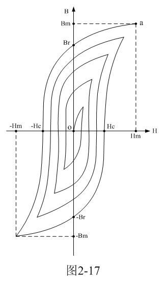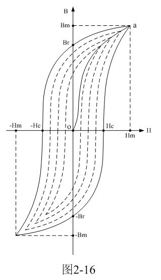 磁矫顽力的大小反映铁磁材料保持剩磁状态的能力。图2-16表明,当磁场按Hm→0→-Hc→-Hm→0→Hc→Hm次序变化时,B所经历的相应变化为Bm→Br→0→-Bm→-Br→0→Bm。于是得到一条闭合的B~H曲线,称为磁滞回线。所以,当铁磁材料处于交变磁场中时(如变压器中的铁芯),它将沿磁滞回线反复被磁化→去磁→反向磁化→反向去磁,这个过程周而复始。