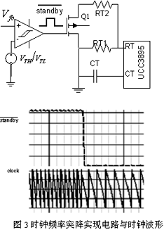 突降实现方法如图3:以UCC3895为例,当电源处于正常负载状态时,Q1导通,其时钟周期为: