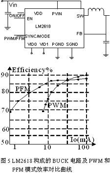 对于额定功率时工作在PWM模式的开关电源,,也可以通过切换至PFM模式提高待机效率,即固定开通时间,调节关断时间,负载越低,关断时间越长,工作频率也越低。图5是采用NS公司的LM2618控制的Buck转换器电路和分别采用PWM和PFM控制方法的效率比较曲线。由图可见,在轻载时采用PFM模式的电源效率明显大于采用PWM模式时的效率,且负载越低,PFM效率优势越明显。