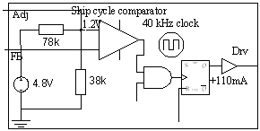 NCP1200的内部跳周期??榻峁辜?,当反馈检测脚FB的电压低于1.2V(该值可编程)时,跳周期比较器控制Q触发器,使输出关闭若干时钟周期,也即跳过若干个周期,负载越轻,跳过的周期也越多。为免音频噪音,只有在峰值电流降至某个设定值时,跳周期模式才有效。