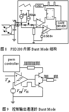 而FSD200则是通过控制内部驱动器实现可控脉冲模式,即将Vfo 脚的反馈电压与0.6V/0.5V迟滞比较器比较,由比较结果控制门极驱动输出,其结构可见图8。我们可根据此原理用分立元件实现普通芯片的BurstMode功能,即检测次级电压判断电源是否处于待机状态,通过迟滞比较器,控制芯片输出,电路如图9所示。