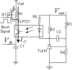 另外对于有使能脚的PWM控制器,如L6565等,用可控脉冲信号控制使能脚使控制芯片有效或失效,可以实现BurstMode,上述BurstSignal可由图1中所示的迟滞比较器产生。