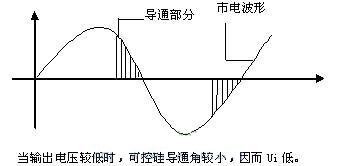 而当输出电压Uo很低时,可控硅导通角很小,绝大部分市电电压被可控硅“卡断了”(如下图所示),只让很低的电压加在变压器初级,即Ui很低,这当然经整流滤波后输出电压也就很低了。