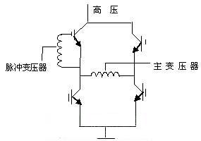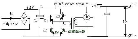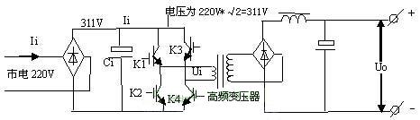 由电路可以看出,市电经整流滤波后变为311V高压,经K1~K4功率开关管有序工作后,变为脉冲信号加至高频变压器的初级,脉冲的高度始终为311V。当K1,K4开通时,311V高压电流经K1正向流入主变压器初级,经K4流出,在变压器初级形成一个正向脉冲。