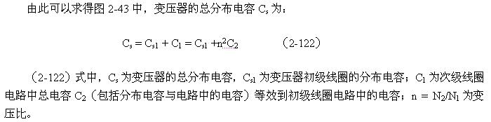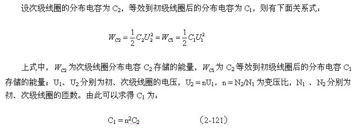 (2-122)式中,Cs为变压器的总分布电容,Cs1为变压器初级线圈的分布电容;C1为次级线圈电路中总电容C2(包括分布电容与电路中的电容)等效到初级线圈电路中的电容;n = N2/N1为变压比。