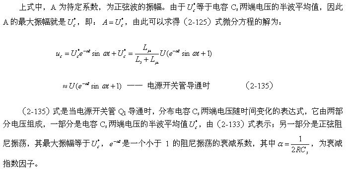 直到t2时刻,流过Ls的电流等于0,电容器Cs充电结束,同时Cs两端的电压也达到最大值;然后电容按正弦曲线开始放电,流过Ls的电流开始反向,到t3时刻,Cs两端的电压又与输入电压U相等,电容停止放电,但流过Ls的电流不能为0,Ls将又产生反电动势给电容Cs进行反向充电,所以Cs两端的电压低于输入电压U。
