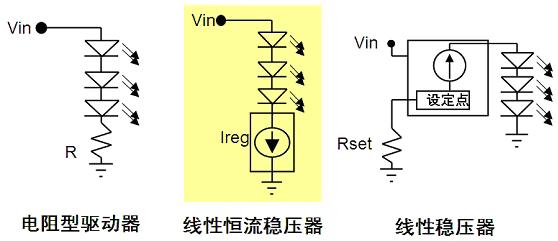 开关稳压器的能效高,且提供极佳的亮度控制。线性稳压器结构比较简单,易于设计,提供稳流及过流?;?,且没有电磁兼容性(EMC)问题。