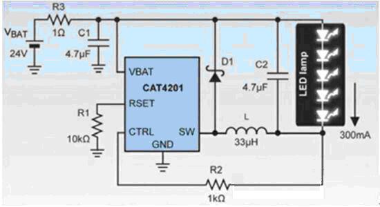 智能楼宇中的备用电源一般为直流24V,市电断电之后仍需要备用照明长时间的工作,省电是备用照明的重点,此时正是电感型转换器LED驱动器的用武之地。图3说明了如何利用CAT4201从一个24V电源来驱动5只1W的LED。