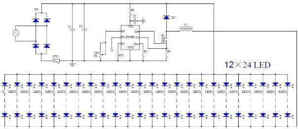 本方案整体供电效率可达80%以上,典型为85-88%;可调节毫安级到安培级的输出应用;低频可变占空比的数字脉冲调光功能和线性调光功能;多达上百个LED的串/并联使用;内部集成频抖功能改善EMI;外部设定LED过温?;すδ?。最大的特点是成本控制好,使用较少的元件,达到了高效低成本的驱动要求以满足民用照明的需要。