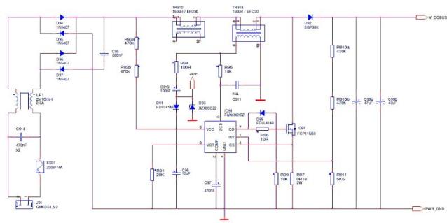 FSFR2100功率开关也是该方案中的一个重要元件。FSFR2100采用零电压开关(ZVS)技术,能够大幅降低MOSFET和整流器的开关损耗。采用这种技术,此开关无需散热器即可处理高达200W的功率,使用散热器更可处理高达450W的功率。