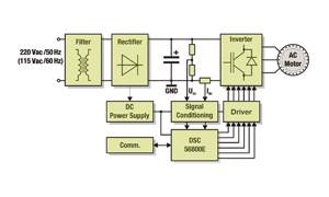 如图1所示,完整的调速驱动系统包括EMI滤波器、输入整流器、直流供电、DSC(数字信号控制器)、信号调理电路,供电变极器,以及门控驱动器等。
