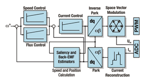 电动机的电流波形是正弦曲线,这可以产生平稳的扭矩,而且会减小机械震动和噪声。外部速度回路调整供电的定子数量,这直接与定子电流的积分成比例,并维持所要求的角速度。为了在基本速度之上扩展工作速度的范围,增加了额外的磁通弱化回路,用于处理定子定向磁通电流。