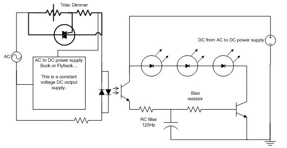 许多高亮度LED驱动器电路都带有一个可作为LED调光之用的比较器。其中有些电流输出很小,并可读取引脚上的电压,用以控制初级端开关或低频占空比。在任何一种情况之下,关键都在于把AC占空比转换为可用值。光耦合电路可以很好地做到这一点,并提供隔离,故可以在初级端或次级端电路的任何地方使用这些数据。