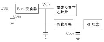 对于这种架构,有时负载开关会连接到降压变换器输出(图2),然后射频模块连接到负载开关,这样降压变换器就只能用较小的输入电容。这将导致输入电压纹波大,尤其是其输出瞬态过载时,输入电压的最低点可能低于其最小工作电压Vcc(Min),系统将关断而复位重新起动,因此也不建议采用这种方式。