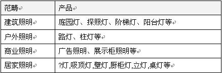 随着技术的改善,LED灯具的用途已由过去数十年单纯应用在指示灯、信号灯等,逐步使用在手机背光源、车内用照明、煞车灯、LCD电视、手提电脑背光源等辅助照明;而在近两年内,其开始成为主照明系统,所应用的范畴可涵盖建筑、户外、商业、及居家等,产品则分别有: