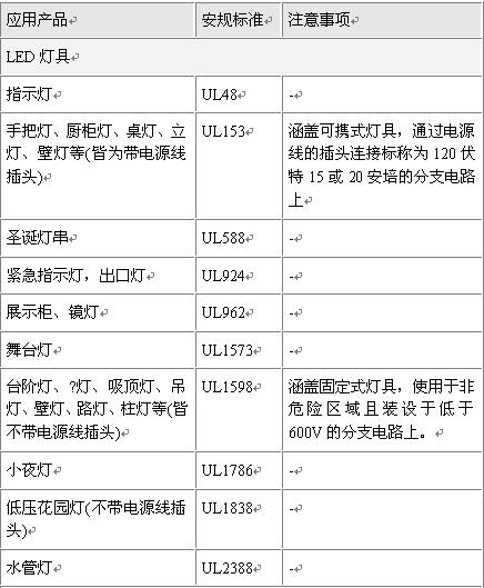 以下首先针对LED灯具、LED灯泡及LED驱动器等三种基本产品分类,及其分别沿用至各成品或零件时,所应参考的UL安规标准及应特别注意事项,以做为业者欲进行产品安规检测的基本指南。不过该表仅供读者参考,产品实际的归类,仍须依产品的用途及其使用环境来决定。