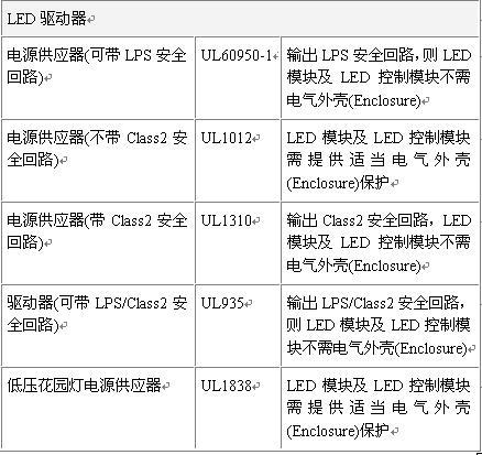 4.其它要求:如LED电源、LED数组、LED??榧癓ED控制模块等安全及外壳要求等。LED的电源可以是下列标准所验证的电源供应器,包括UL1012,UL1310及UL60950-1。基本上,LED数组、LED??榧癓ED控制??橹灰挥贚PS/Class2安全回路上,就没有任何电气外壳的要求。LED灯具对于电源输出方式的规定为基本绝缘,与完全没有隔离是一样的。对于LED数组、LED??榧癓ED控制模块,如果使用的电源不用大到超过LPS/Class2,建议最好要符合LPS/Class2。反之,若使用的能量将大于LPS/Class2,则有没有提供隔离一次侧与二次侧电源电路的绝缘,对塑料外壳的要求上,是没有差别的。