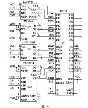 TLC0834是4路8位A/D转换器,采集1路电压和3路电流信号;TLC5615是10位串行D/A,将控制量变为模拟电压信号,去控制可控硅交流调压;X25045是含WDT和EEPROM的多功能电路,负责单片机系统的安全监视和重要参数的?;ぃ籗N75176是RS485接口,实现连网监控。