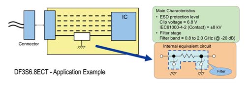 东芝美国电子元器件公司(TAEC)最新推出具有静电放电(ESD)?;ず偷绱鸥扇牛‥MI)滤波的二极管。东芝DF3S6.8ECT?;ざ芴峁┦趾鸵贫骷纾菏只?,PDA,笔记本电脑,数码相机,以及具有EMI和ESD保护的GPS设备,这些静电放电能源通过用I/O端口和通过连接器进入到系统电路板上。