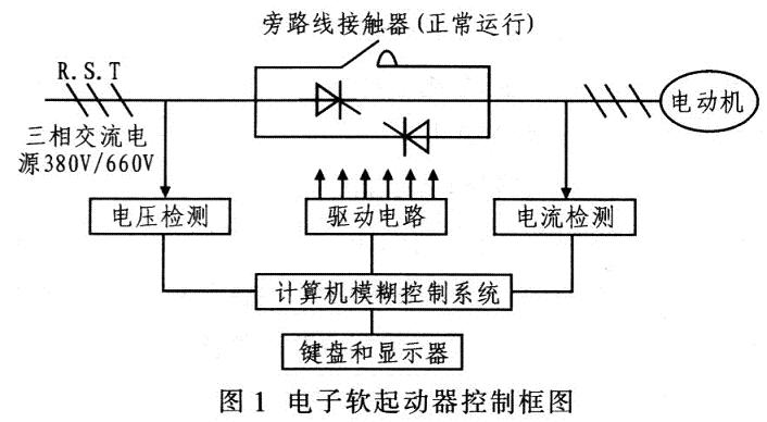 软起动有磁控降压软起动器和电子软起动器。其中,磁控降压软起动采用控磁限幅调压方式减压调控电动机起动时的电压,实质就是电抗器降压起动。电子软起动器有晶闸管调压软起动和变频器调速软起动。晶闸管调压软起动器的主回路采用6只晶闸管两两反向并联组成的调压电路,并焊接于电动机的三相供电线路。当起动器的微机控制系统接收到起动指令后进行有关计算。输出晶闸管的触发信号,通过控制晶闸管的导通角起动器按所设定的模式调节输出电压,从而控制电动机的起动。当电动机起动完成后,起动器吸合旁路线接触器,使晶闸管短路,电动机直接投入电网运行,避免不必要的电能损耗。图1为电子软起动器控制框图。