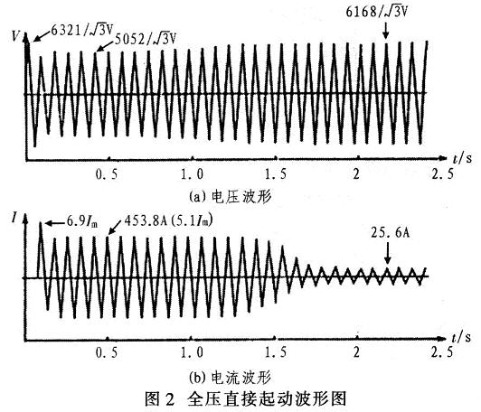图2为全压直接起动的电压、电流波形。由图2(a)电压波形可见,电动机起动前系统电压为