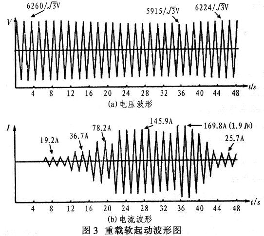 图3为重载软起动的电压、电流波形。从图3(a)电压波形可见,电动机起动前系统电压为