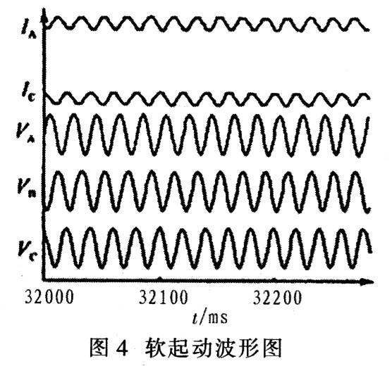 通过对比验证看出,用软起动效果远好于常规起动,虽然在起动过程中,起动电流中含有一定的高次谐波,而电压中却只有很小的高次谐波,电压的总谐波畸变率为2.72%,如见图4所示,所以并不会对系统造成影响。