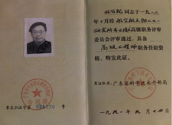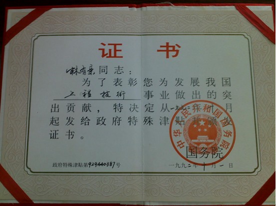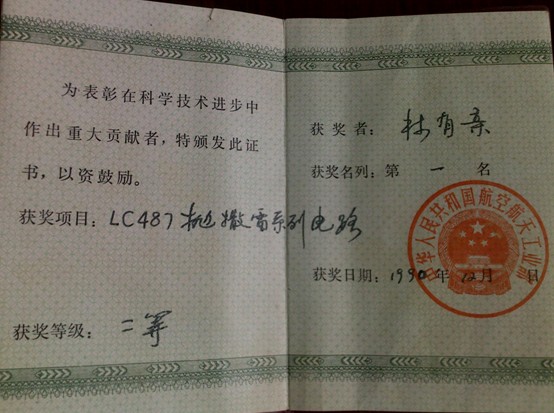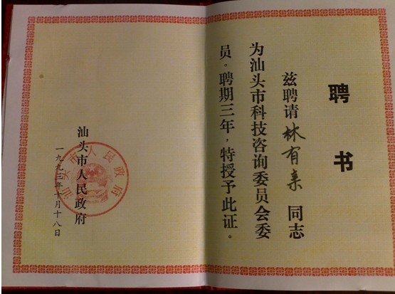 林有亲先生的荣誉证书