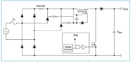 不具备PFC 功能的马达驱动电路前端非常类似于一个开关模式的电源。在这个电源中有一个大容量电容,它将消除整流电源中的直流。当马达驱动电路首次通电时,由于大容量电容上没有电荷,整流电源的输入端看起来就像是一个短路电路。当通电时,这种情况将产生较大的浪涌电流,以为电容器充电。如果上述浪涌电流未得到控制或限制,那么线路中的电流消耗将迅速飙升,从而超过其正常 RMS 工作电流(请参阅图 1)。这些过大的电流会对保险丝、焊点和电子组件等机械和电气元件造成潜在的损坏或应力。