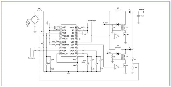 图 3 显示了业界首款单芯双相交错式 PFC 预调节器——TI UCC28070 的简化原理图。交错双相相互之间的相位差为 180°,这样则消除了波纹电流,从而可以使用更小的电磁干扰 (EMI) 滤波器以及外观更小巧的 PFC 输出电容器。双相交错式拓扑结构、体积更小的元件是嵌入式马达驱动电路的理想解决方案。交错式 PFC 可满足非常高的功率密度要求。