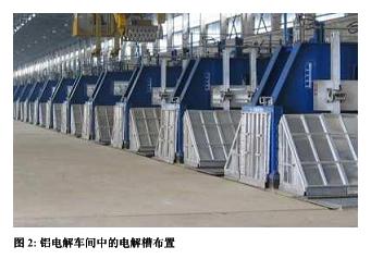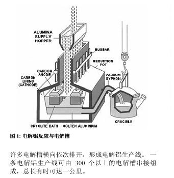 电解槽为大而浅的钢槽,内侧衬有碳层,不同电解槽在电气上为串联连接。每个电解槽中,直流电流经石墨阳极流入呈融化状的氧化铝电解液,然后经电解槽内衬的碳阴极流出,进入下一电解槽的阳极,依次类推。在电流的作用下,氧化铝中的氧元素被分离出来,并在电解槽上部与碳化合形成二氧化碳,而在电解槽底部析出液态的铝。以上生成过程见图1。