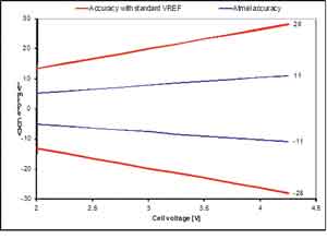 BM器件中常用的标准带隙基准源针对额定变化被校准,在25℃时的精度极高。然而,曲率形状和位置变化的补偿也相当常见,这就产生与温度变化有关的大幅变化,使得在高和低温时电池电压测量不够精确。此外,也不可能检测和显示出曲线形状显著不同的离群点。