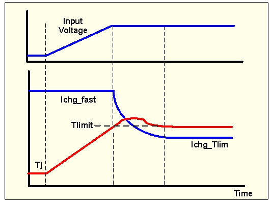 为解决此类散热问题,可添加一个散热环路,以降低充电电流并确保IC结点温度低于热关断阈值。为bq2406X系列线性充电器添加了散热环路的运行如图2所示。散热环路在激活状态下可有效降低充电电流,降低充电器级功率MOSFET的功耗。