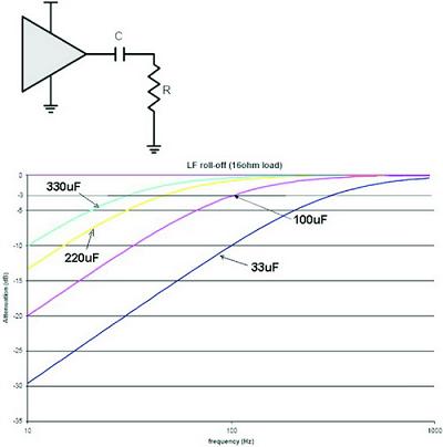 该隔直电容会和耳机阻抗形成一个高通滤波器,理想条件下该高通滤波器的3dB低频截止频率为1/2πRC(R为耳机的阻抗,C为隔直电容的容值)。为了改善耳机低频音效,我们希望此高通滤波器的低频截止频率越低越好,但由于耳机的阻抗是固定的,为获得更好低频响应唯一可以改变的就是电容容值,所以一般用于耳机输出的隔直电容容值都很大,图1所示为选择不同容值的隔直电容时形成的高通滤波器频响曲线。