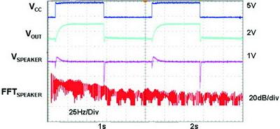即电容充放电产生的电流。图2揭示了当耳机驱动器上电和断电时,隔直电容充放电电流在耳机负载上产生的电压瞬变,由于该电压瞬变的频谱很宽,落在人耳可以的听到频率范围内就形成了爆破音。