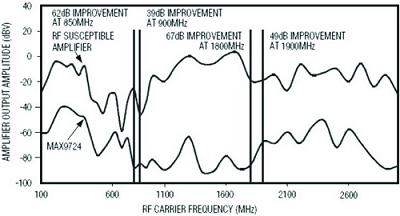图6Maxim公司的耳机驱动器MAX9724极大提升了抗射频解调能力