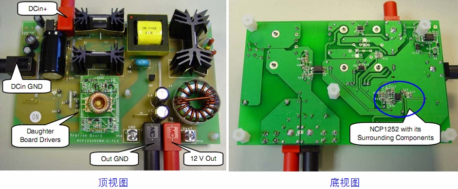 NCP1252演示板的详细电路图参见参考资料2,其顶视图和底视图则见图3。