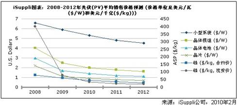 2010年将保持这种趋势,尽管价格下跌速度可能减慢。晶体组件价格将下降20%,晶片价格将下滑18.2%,多晶硅将下跌56.3%。