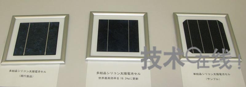 左起依次为现有的多晶Si电池单元、单元转换效率为19.3%的多晶Si电池单元,以及此次宣布涉足市场的单结晶Si电池单元(样品)。