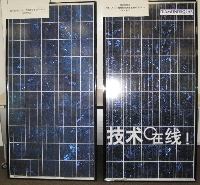 现有的输出功率185W多晶Si型面板(左)和将于2010年6月投放日本市场的190W多结晶Si型面板。通过将各单元上作为电极的总线布线从2根增至4根,提高了输出功率。