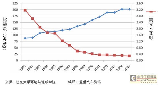 图1:1991-2005年车用锂电池能量密度提升和成本下降情况