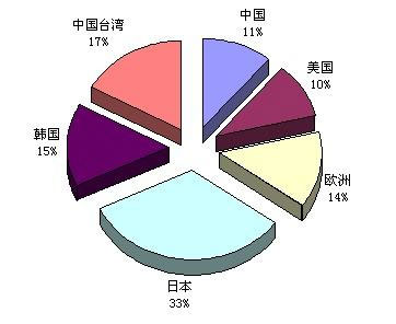 如果以地区别来观察,日本全球的产值仍居冠,台湾厂商以市占率17%排名第二。而韩国的市占率由2008年的9%窜升到2009年的15%,位居全球第3。