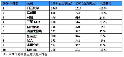 以个别厂商营收观察,较早切入大尺寸背光市场的LED供应商,营收都在金融 海啸中逆势成长,例如韩国SamsungLED、首尔半导体 、日本厂商丰田合成等厂商。在营收排名上,2009年日亚化仍居全球第1名。其次是OSRAMOpto.与CREE等传统LED大厂,台湾厂商光宝、亿光也都入榜前10名。