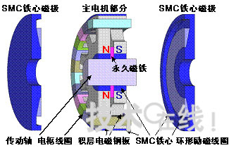 为了有效协调两种磁铁,名古屋工业大学采用了SMC(Soft Magnetic Composites=软磁性复合材料)铁心。SMC铁心是对铁粉等带有磁性的粒子表面被覆绝缘层,并压缩成形和经热处理而制成。能够以低成本量产和成形具有复杂三维构造的磁性部件。
